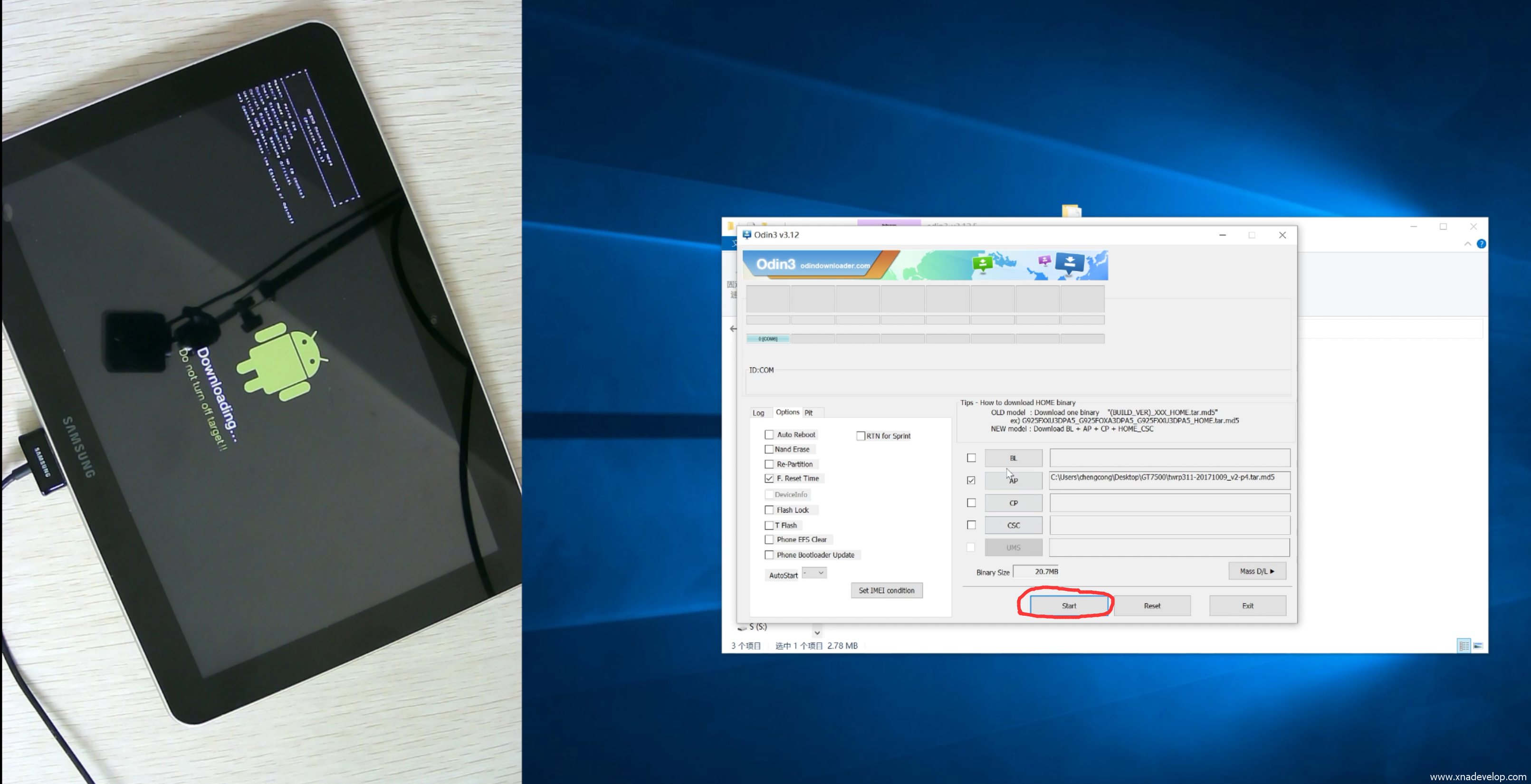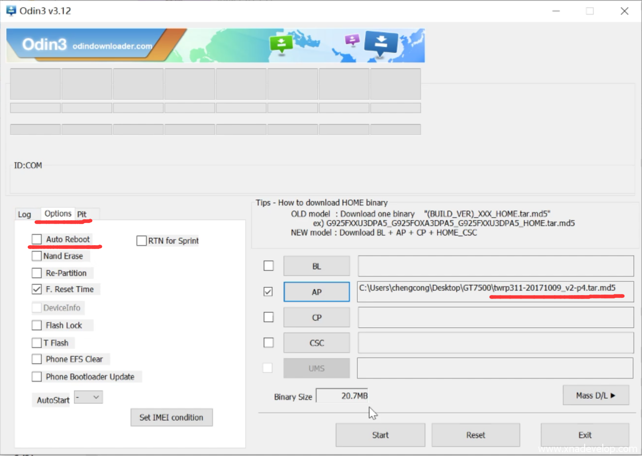 选择刷机包中的【twrp311-20171009_v2-p4.tar.md5】。点击Options选项卡,取消勾选,【Auto Reboot】