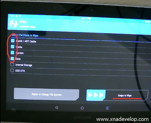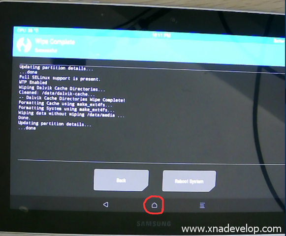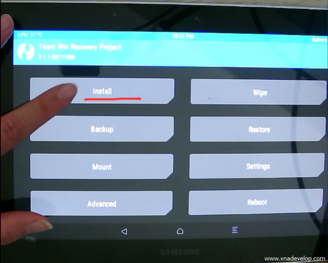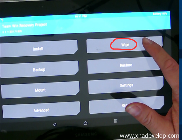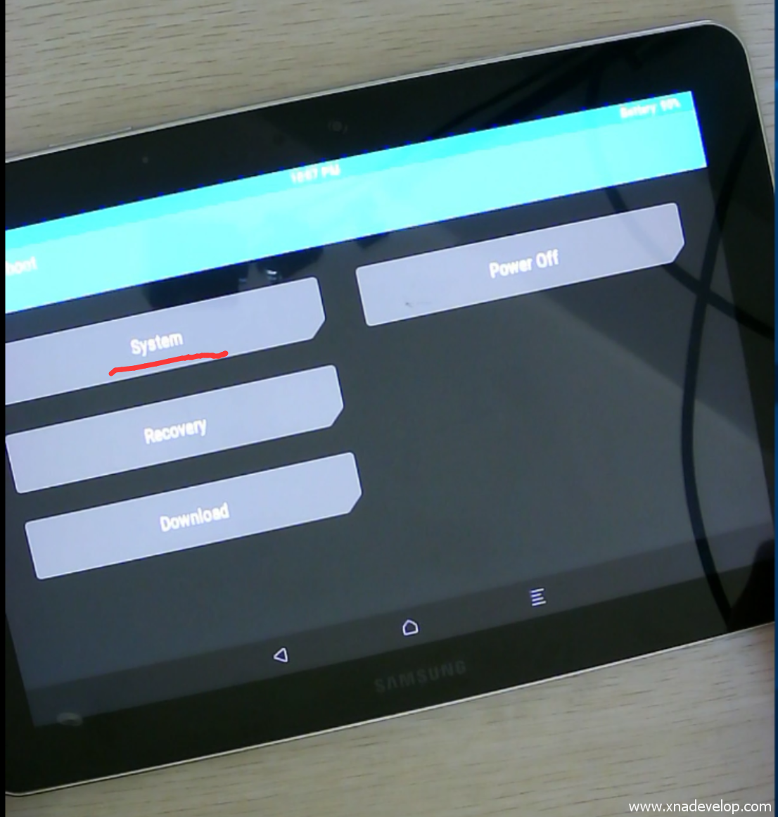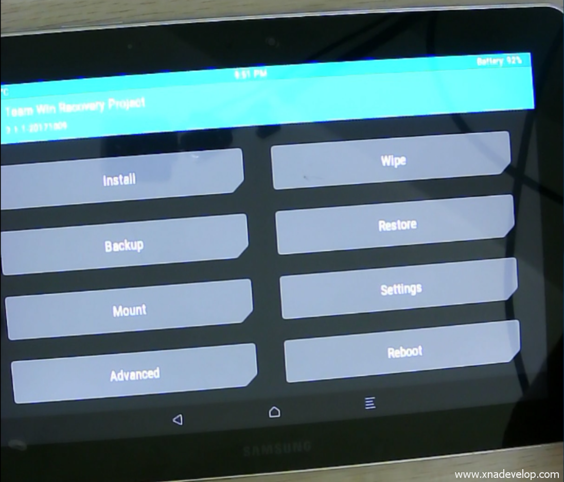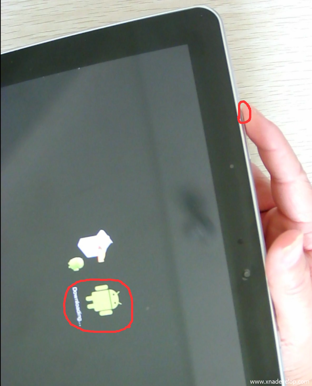 平板电脑关机,按住【声音下键】,按下【电源键】,看到Galaxy Tab字样以后松开【电源键】直到看到两个安卓机器人图案后松开。选择左侧小机器人图标,按下【音量上键】进入TWRP