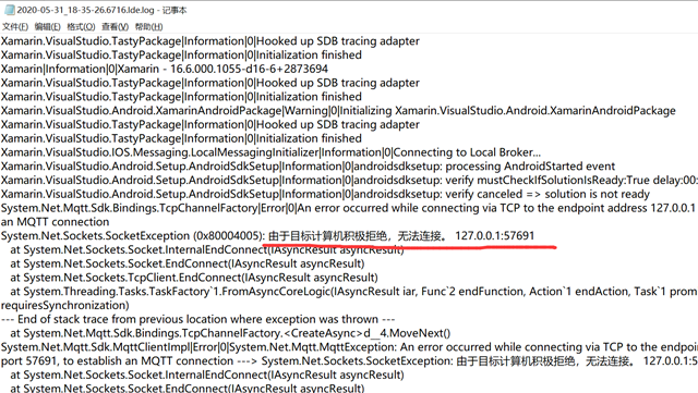 通过Help/Xamarin/Open Logs.打开日志文件发现127.0.0.1无法连接,这说明连接模拟器出现问题!