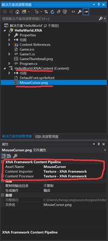 各位可以右键图片另存为并重命名为MouseCursor.png。然后将该png图片拷贝到【HelloWorld.XNAContent】项目中。选中MouseCursor.png右键属性,将图片的AssetName改为MouseCursor。Content Importer为Texture-XNA Framework,Content Processor为Texture-XNA Framework (默认无需修改)