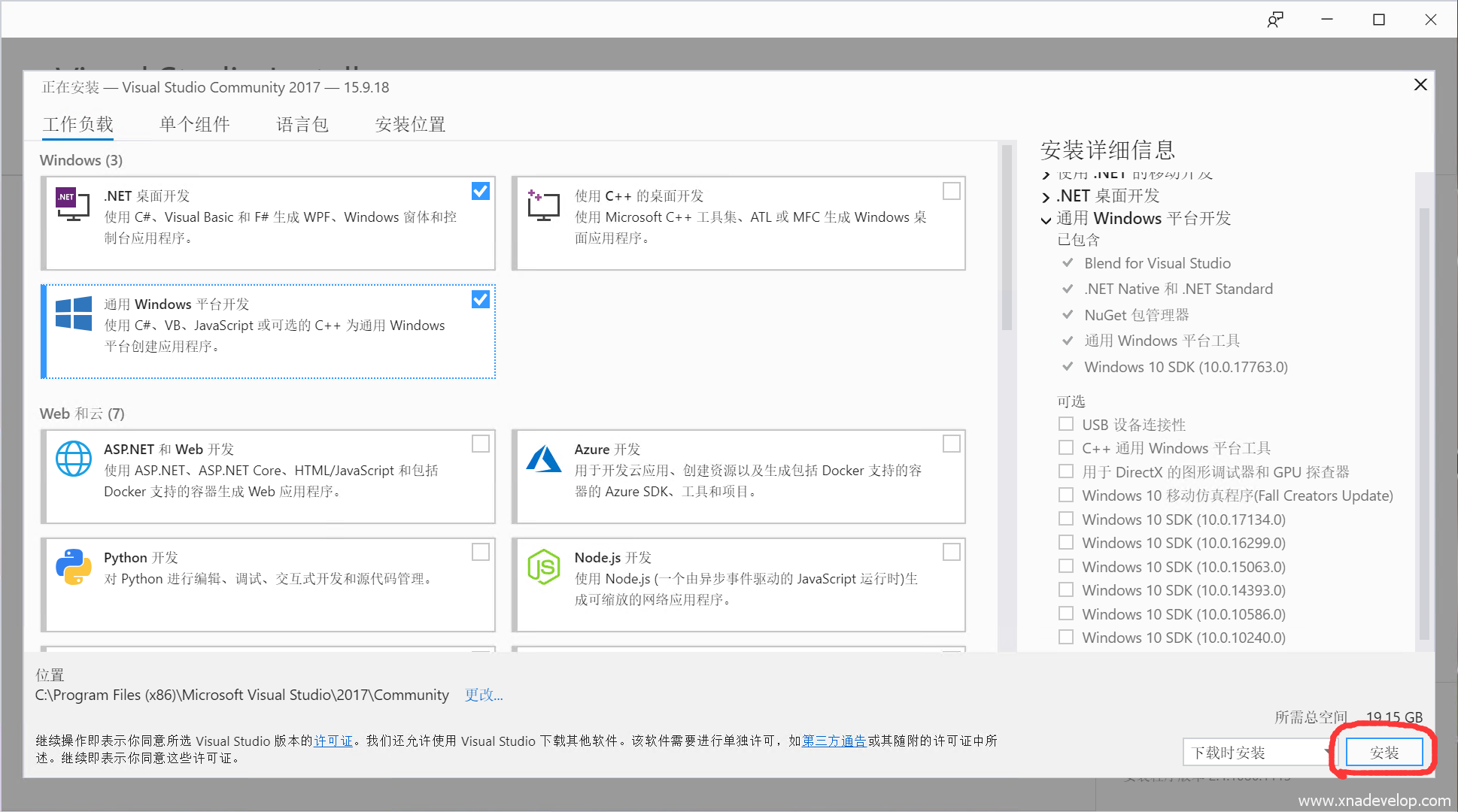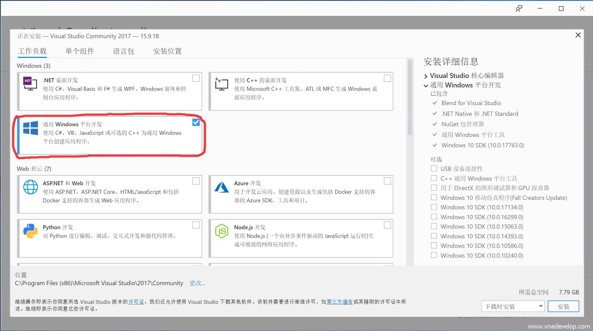 勾选【通用Windows平台开发】,注:C#开发的游戏可发布到微软应用商店,可运行在Windows10的设备上,包括Windows 10 mobile
