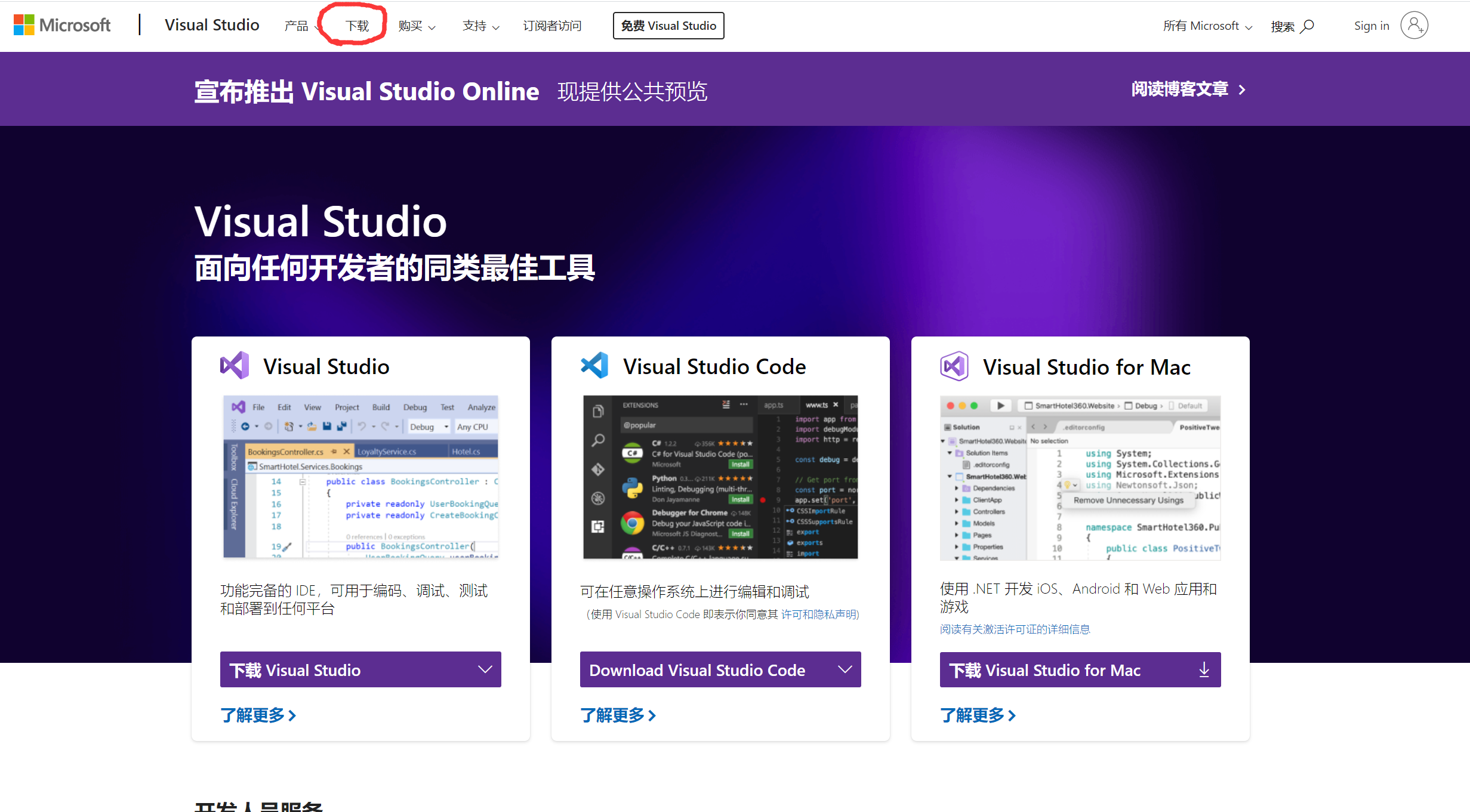 打开www.visualstudio.com,点击下载