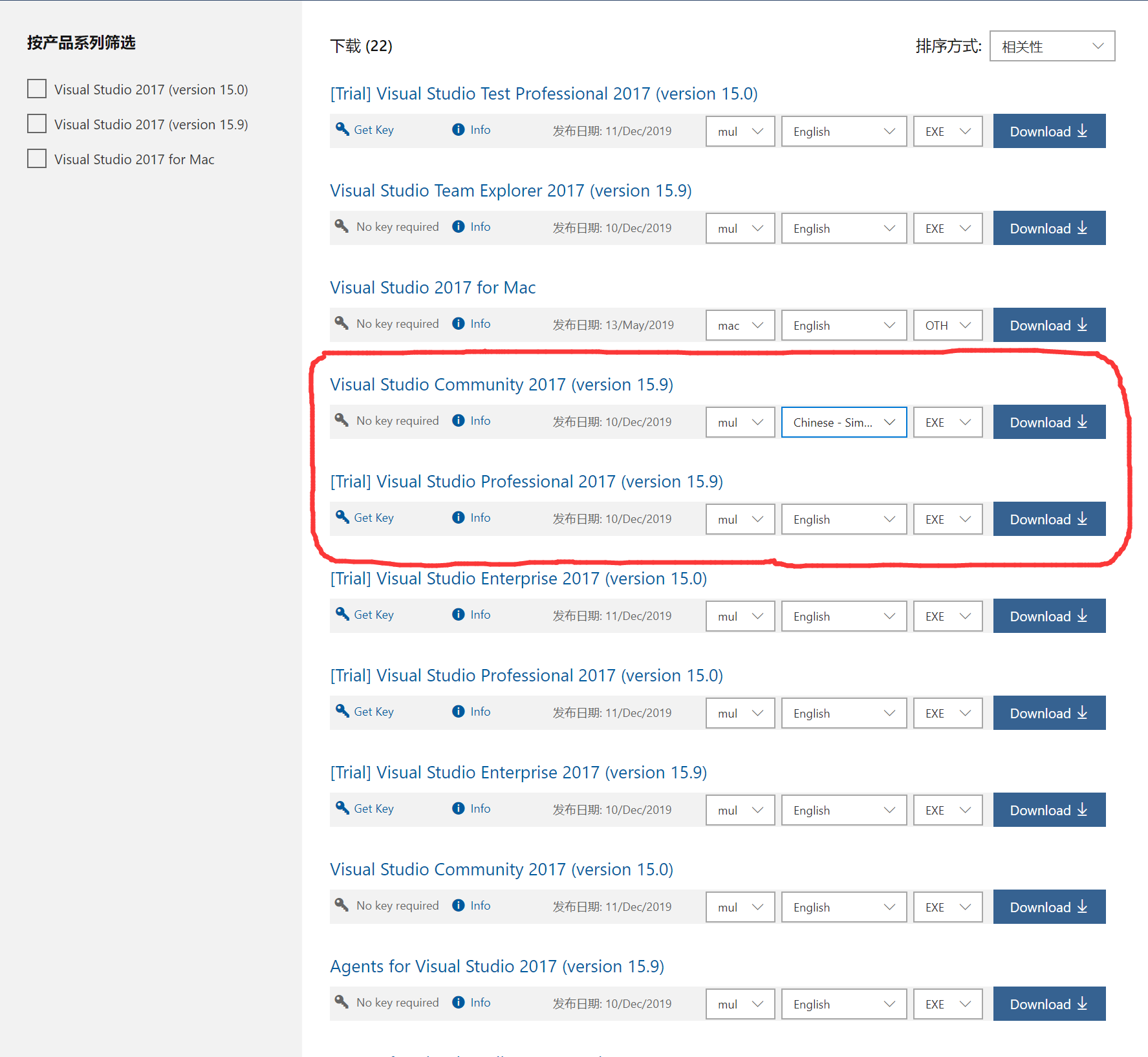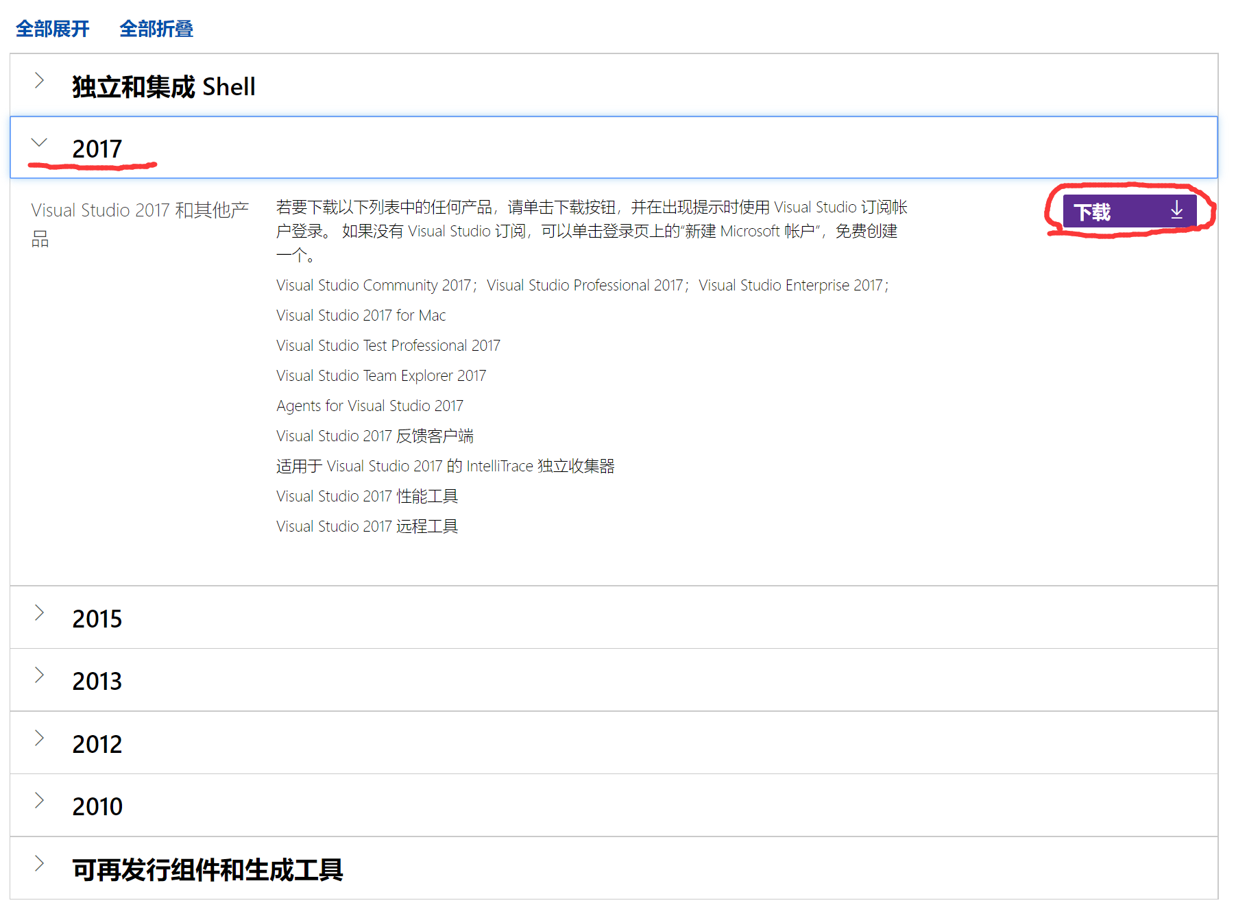 找到【2017】,点击下载,或点击https://my.visualstudio.com/Downloads?q=visual%20studio%202017&wt.mc_id=o~msft~vscom~older-downloads