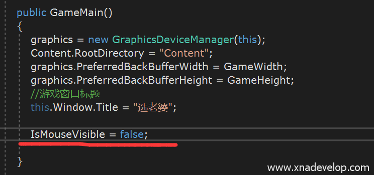 首先解决鼠标问题,找到【SelectWife.Shared】项目中的GameMain.cs文件,在GameMain构造函数中加入