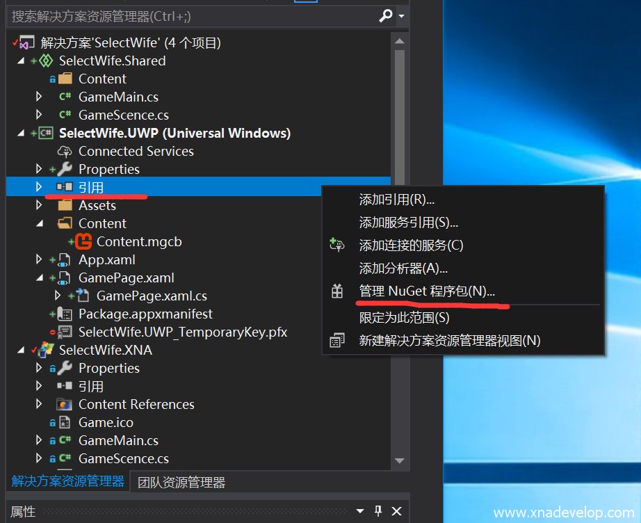 选择【SelectWife.UWP】项目的引用,点击右键【管理NuGet程序包】