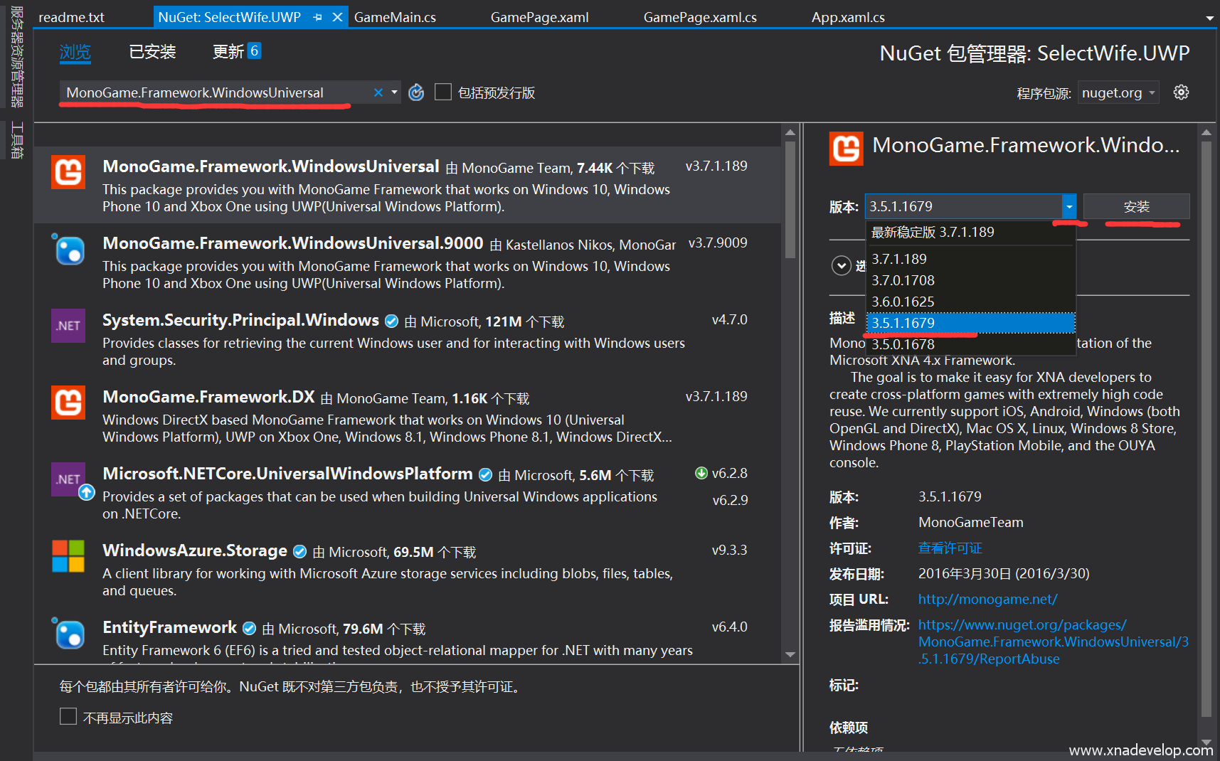 搜索【MonoGame.Framework.WindowsUniversal】,版本选择【3.5.1.1679】点击【安装】