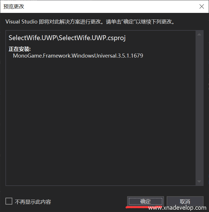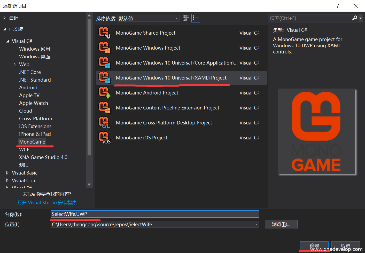 【MonoGame】选择【MonoGame Windows 10 Universal (XAML)Project】名称命名为【SelectWife.UWP】【 确定】