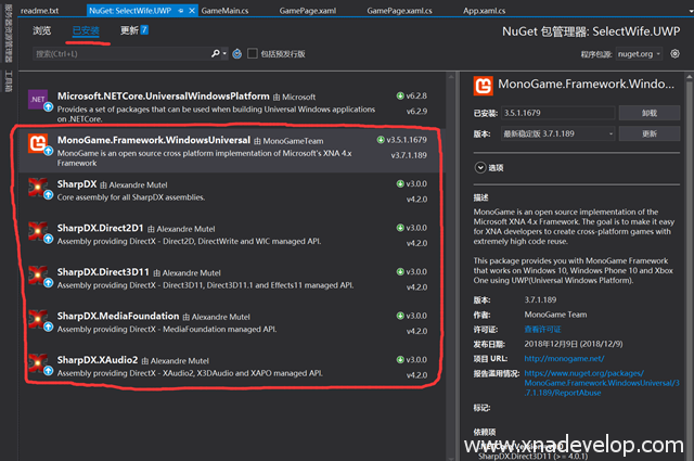 上一篇我谈到如何将《选老婆》发给朋友玩,这篇我来介绍一下如何将《选老婆》移植到通用Windows平台(UWP)。XNA本身并没有跨平台的能力,将游戏运行到其他平台必须安装MonoGame或者FNA,如何安装MonoGame?请点击。