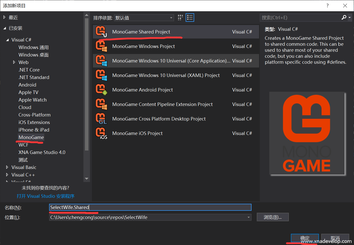 选择【Visual C#】【MonoGame】【MonoGame Shared Project】名称命名为【SelectWife.Shared】点击【确定】