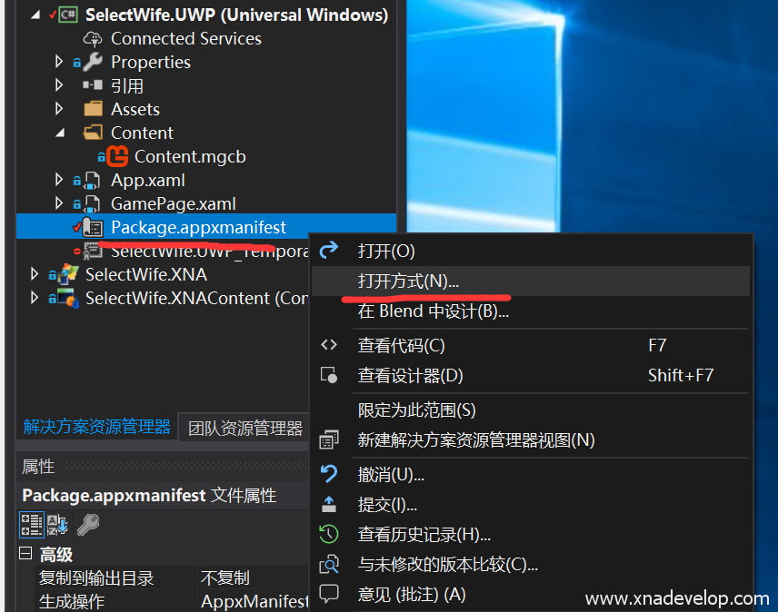 选中【SelectWife.UWP】项目中的Package.appxmanifest点击右键【打开方式】