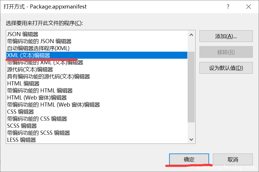 选择【XML文本编辑器】,点击【确定】