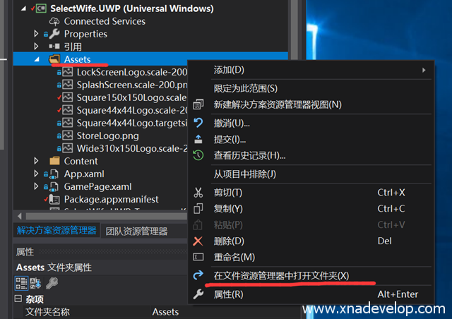 选中【SelectWife.UWP】项目中的【Assets】文件夹,点击右键点击【在文件资源管理器中打开文件夹】