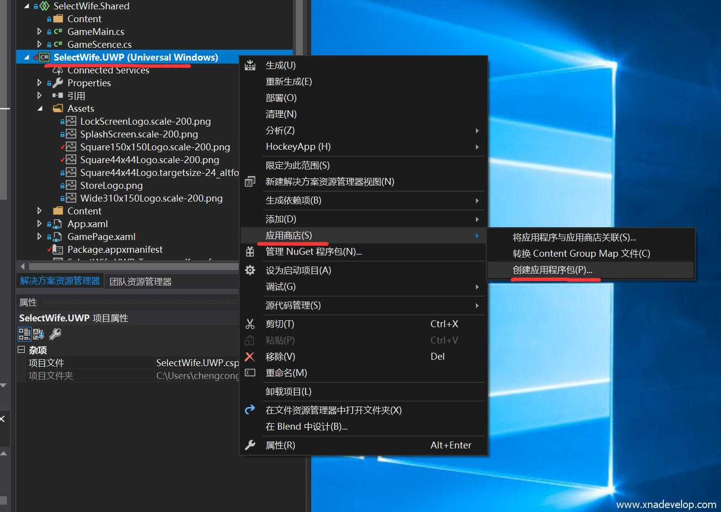 选中【SelectWife.UWP】点击右键【应用商店】【创建应用程序包】