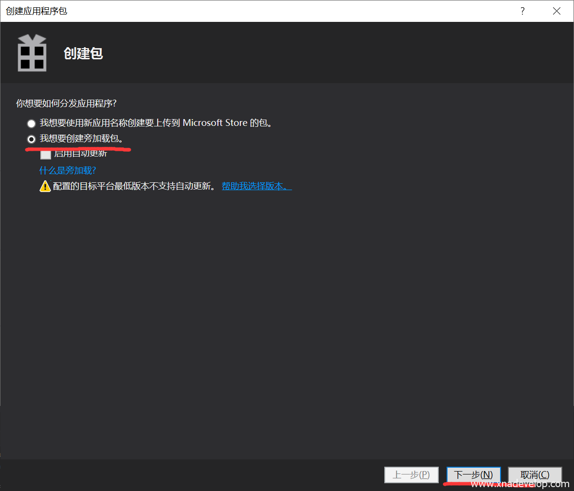 本文假设你没有注册微软开发者账号,选择【我想要创建旁加载包】【下一步】