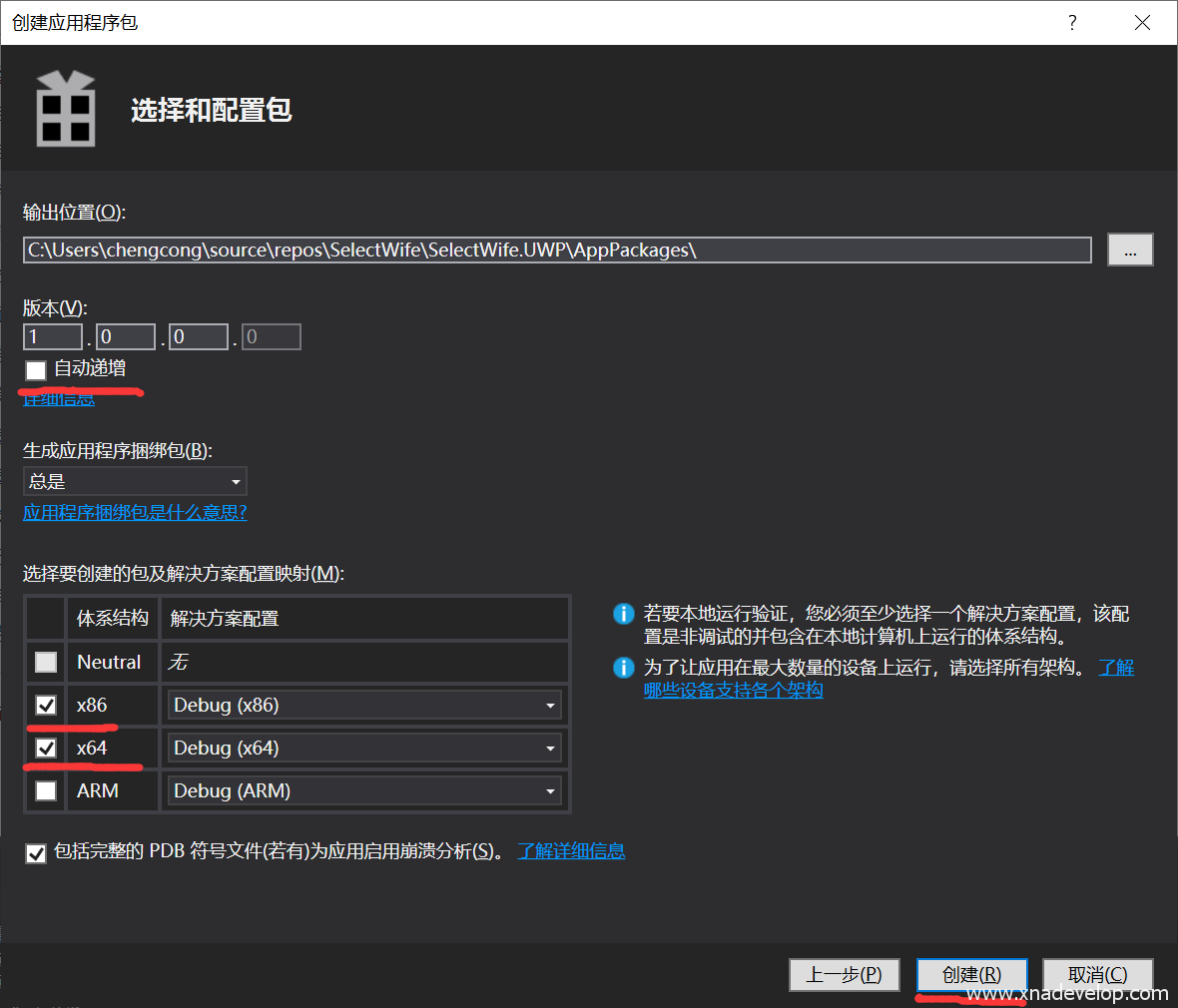 取消自动递增,只勾选【x86】和【x64】,点击【创建】等待完成。