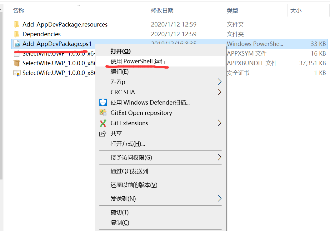 打开【SelectWife.UWP_1.0.0.0_Debug_Test】目录,选中【Add-AppDevPackage.ps1】点击右键【使用PowerShell运行】