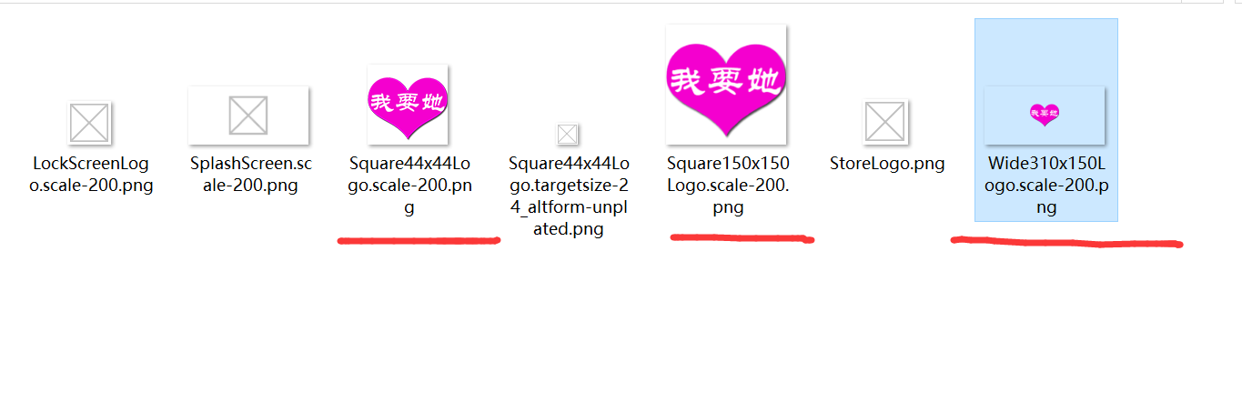 找到【Assets\Logo.png】改为【Assets\Square150x150Logo.png】,【Assets\SmallLogo.png】改为【Assets\Square44x44Logo.png】【SplashScreen.png】改为【Assets\Wide310x150Logo.png】保存。如下图: