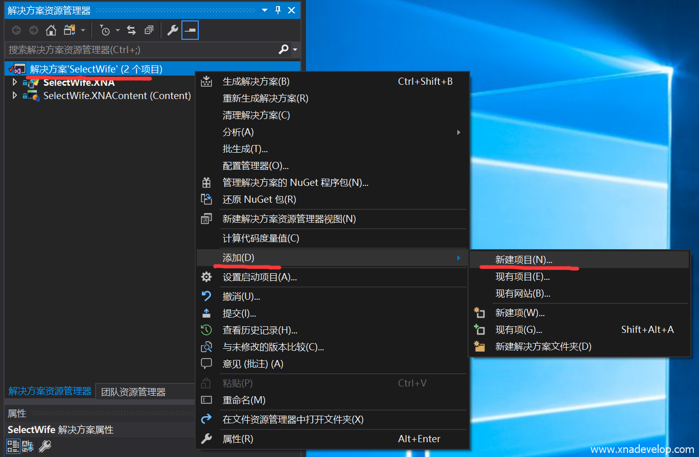 首先,选中【SelectWife】解决方案,点击右键【添加】【新建项目】