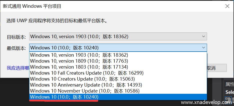 最低版本选择10240,点击【确定】