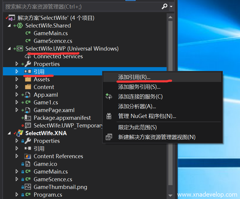 选择【SelectWife.UWP】项目的引用,点击右键【添加引用】