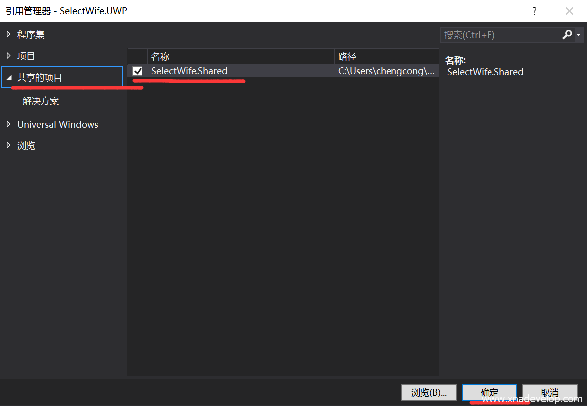 【共享项目】,勾选【SelectWife.Shared】前面的勾,点击【确定】