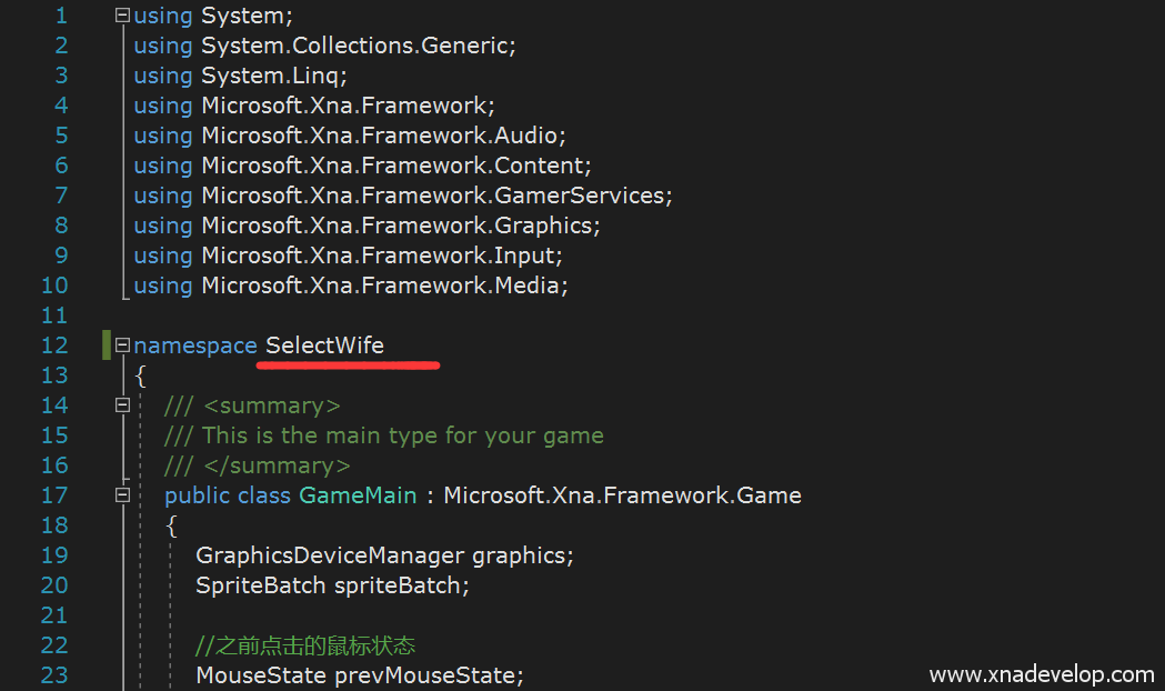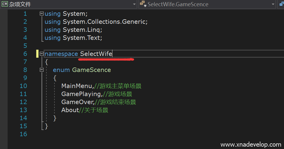 分别打开【SelectWife.Shared】项目中的GameMain.cs和GameScence.cs文件,将名称空间【SelectWife.XNA】改为【SelectWife】