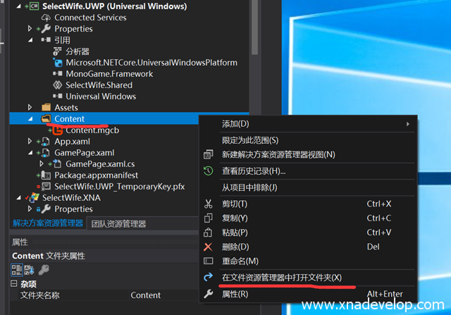选择【SelectWife.UWP】项目的【Content】文件夹,点击右键点击【在文件资源管理器中打开文件夹】