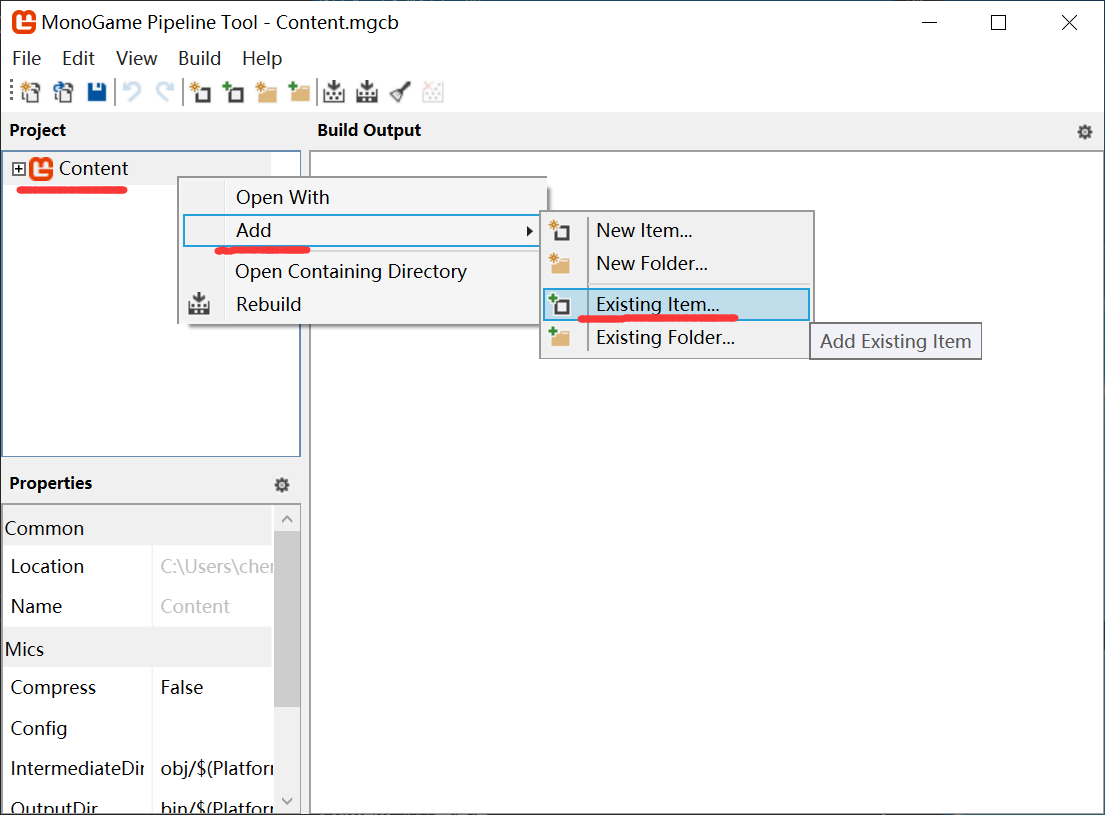 选中左侧【Content】点击鼠标右键【Add】【Existing Item】