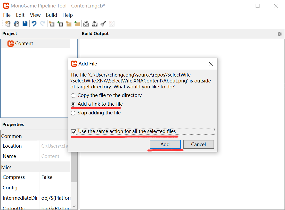 由于我只需要一份资源文件的拷贝(方便以后修改一次多平台共享)所以选择【Add a link to the file】(也可以选择copy the file to the directory)勾选【use the same action for all the selected files】点击【Add】