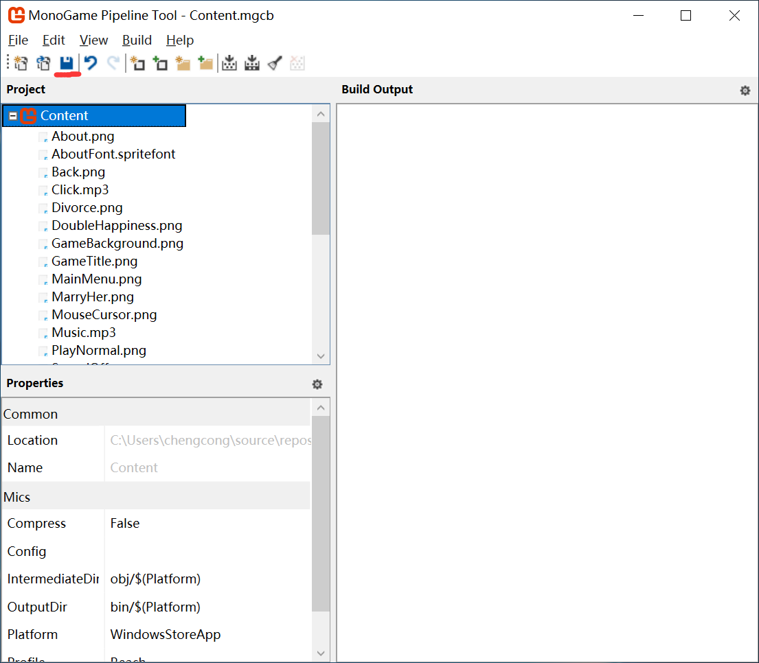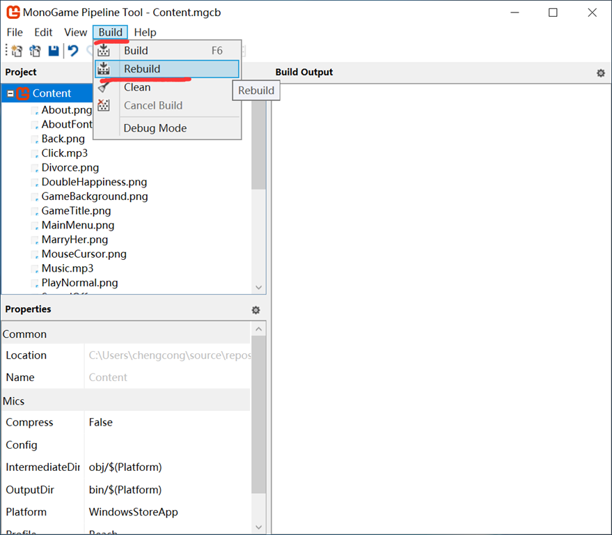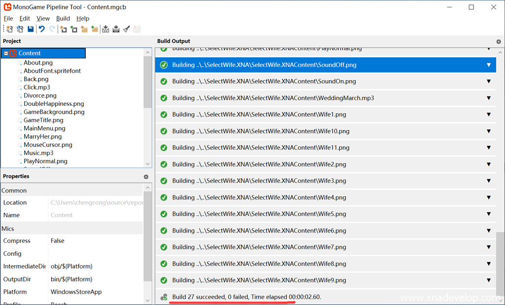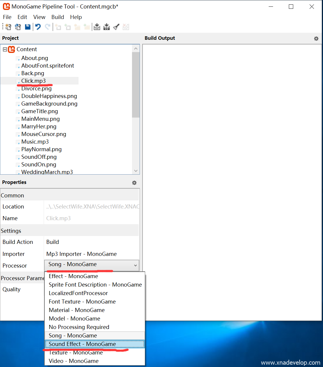 找到【Click.mp3】,默认状态下Content.mgcb会将mp3文件编译为Song,但在代码中使用的是Sound Effect,所以将它的Processor改为【Sound Effect – MonoGame】