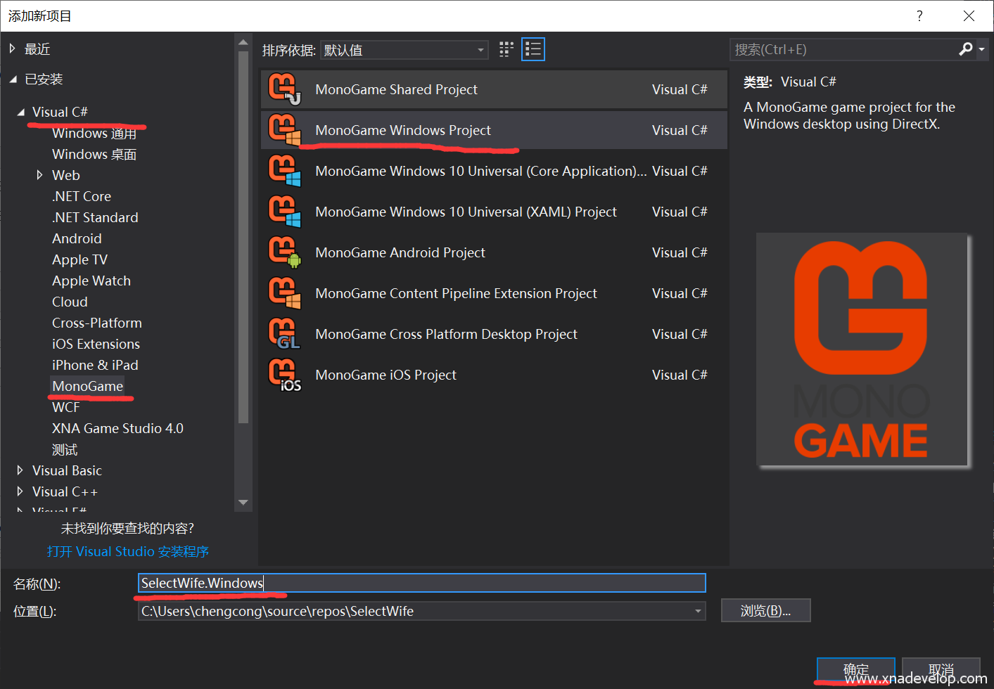 【Visual C#】【MonoGame】选择【MonoGame Windows Project】名称输入【SelectWife.Windows】点击确定