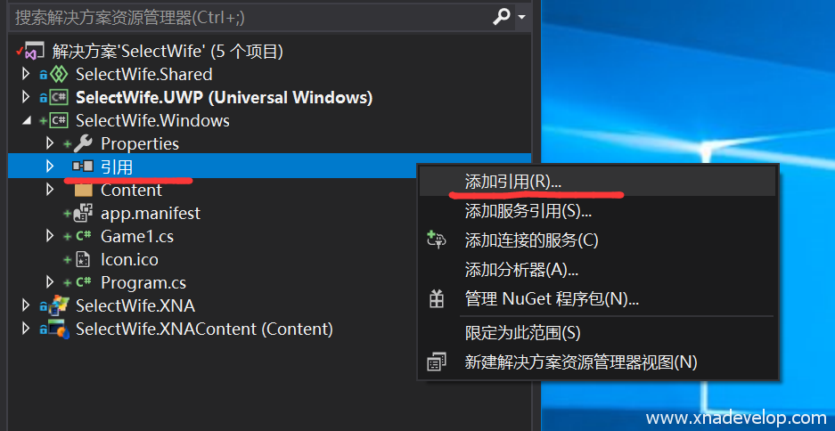 选中【SelectWife.Windows】的【引用】点击右键添加【引用】