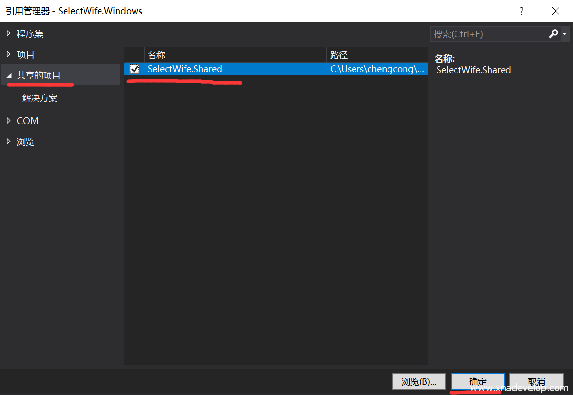 【共享的项目】勾选【SelectWife.Shared】点击【确定】