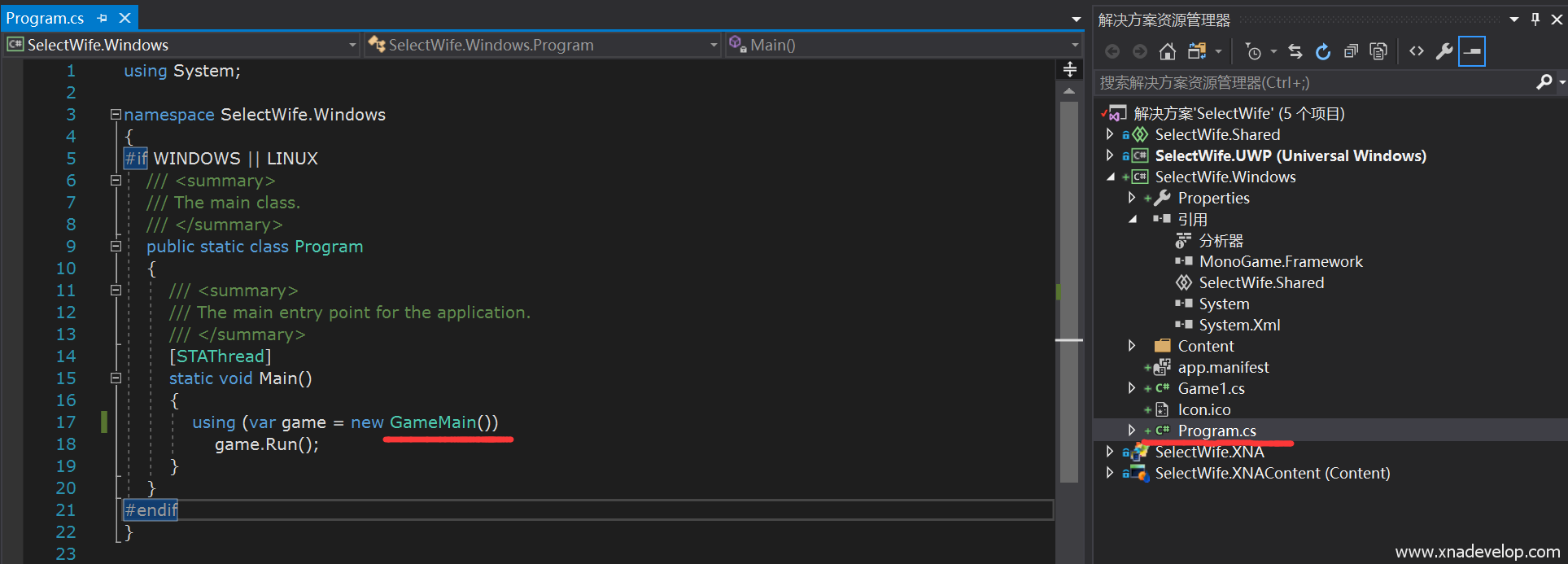 打开【SelectWife.Windows】项目中的Program.cs文件,将Game1改为GameMain