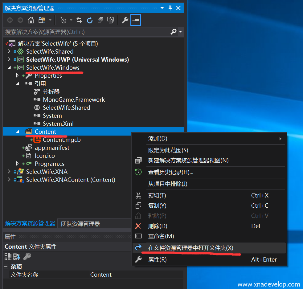 选中【SelectWife.Windows】项目中的【Content】文件夹,点击右键【在文件资源管理器中打开文件夹】