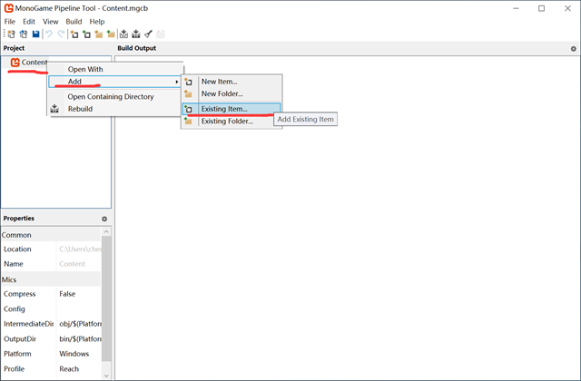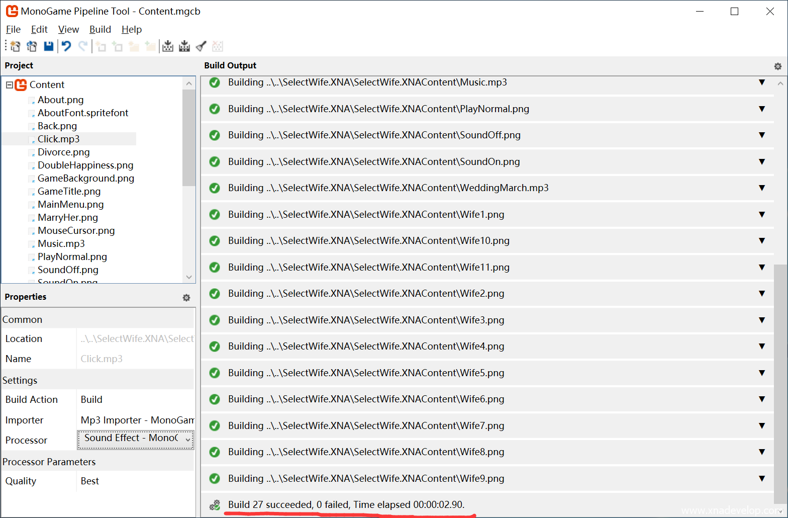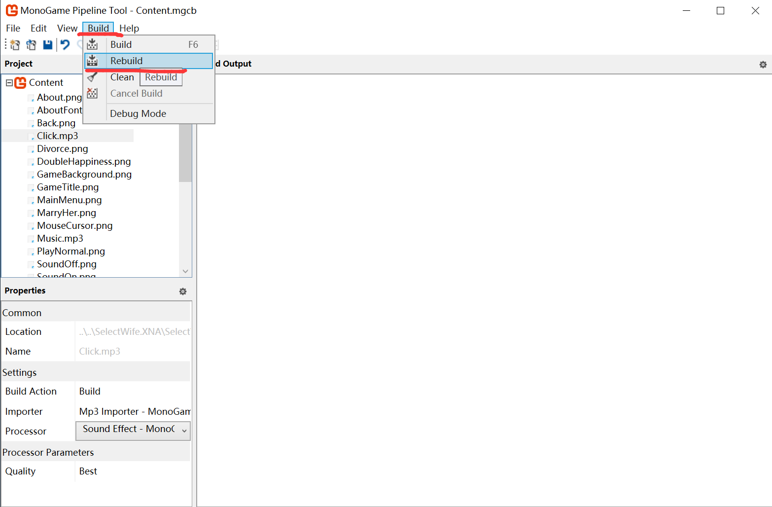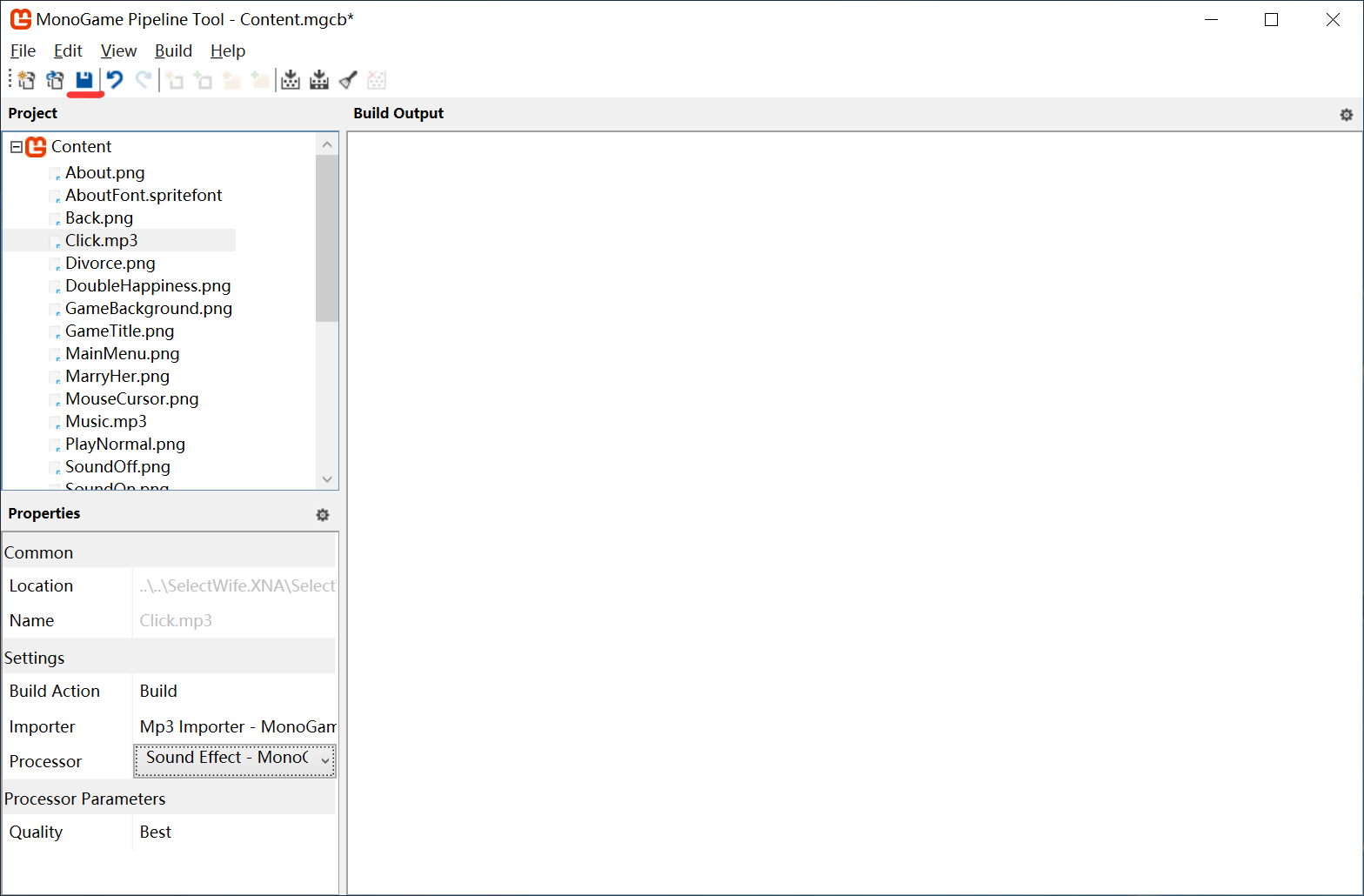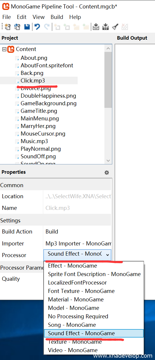 找到【Click.mp3】,默认状态下Content.mgcb会将mp3文件编译为Song,但在代码中使用的是Sound Effect,所以将它的Processor改为【Sound Effect – MonoGame】