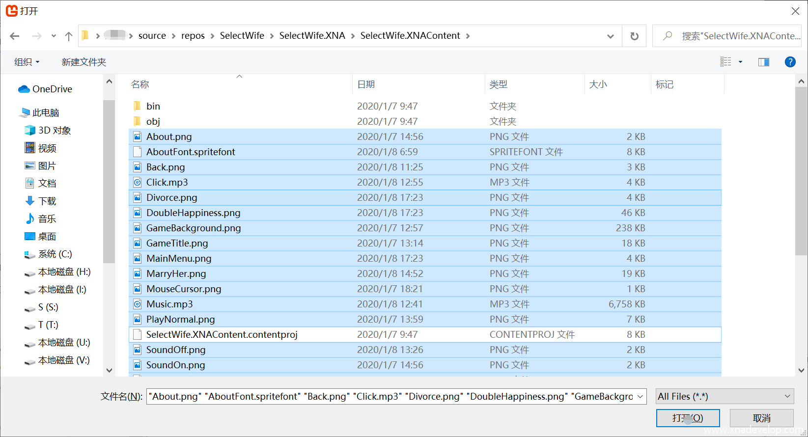 找到【SelectWife.XNAContent】项目所在目录,选中所有文件(但不包括【bin】【object】目录和【SelectWife.XNAContent.contentproj】)