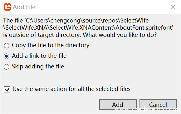 由于我只需要一份资源文件的拷贝(方便以后修改一次多平台共享)所以选择【Add a link to the file】(也可以选择copy the file to the directory)勾选【use the same action for all the selected files】点击【Add】