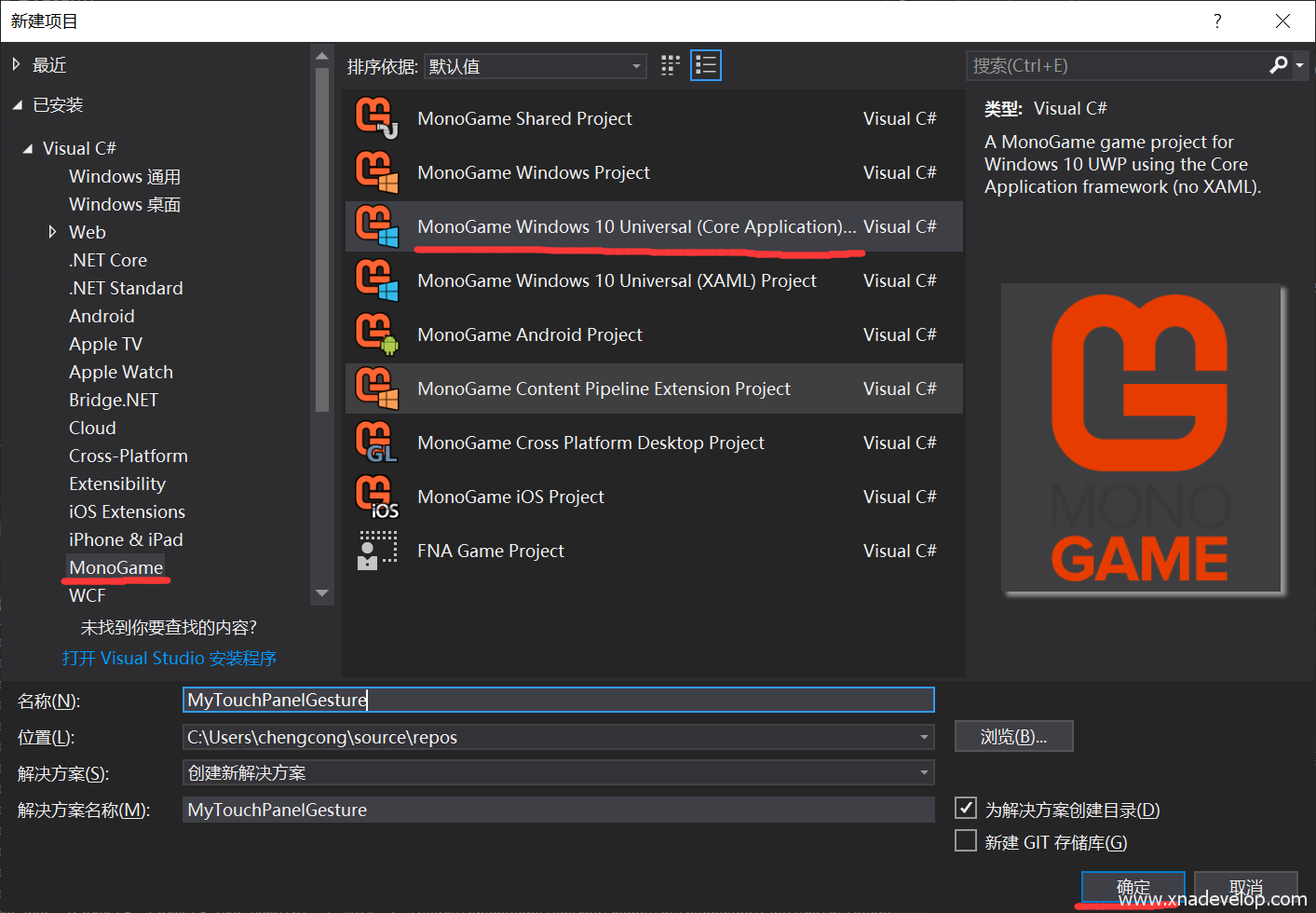 【MonoGame】【MonoGame Windows 10 Universal(XAML)Project】,项目名称命名为【MyTouchPanelGesture】,点击【确定】