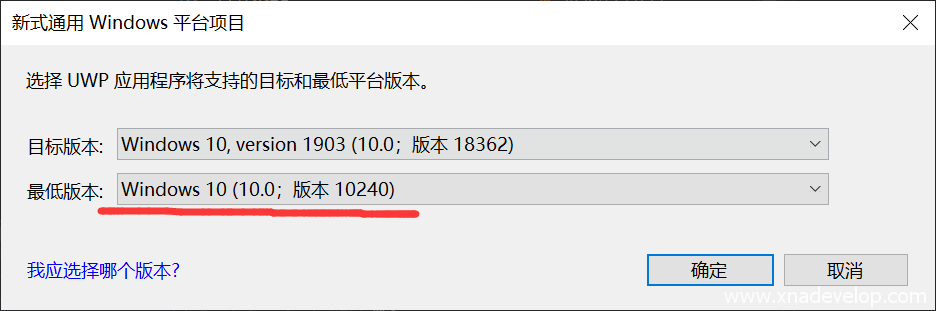 为了支持windows10所有用户,最低版本选择【Windows 10 (10.0;版本10240)】,点击【确定】
