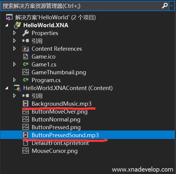 点击【HelloWorld.XNAContent】项目中的【ButtonPressed.mp3】右键属性,