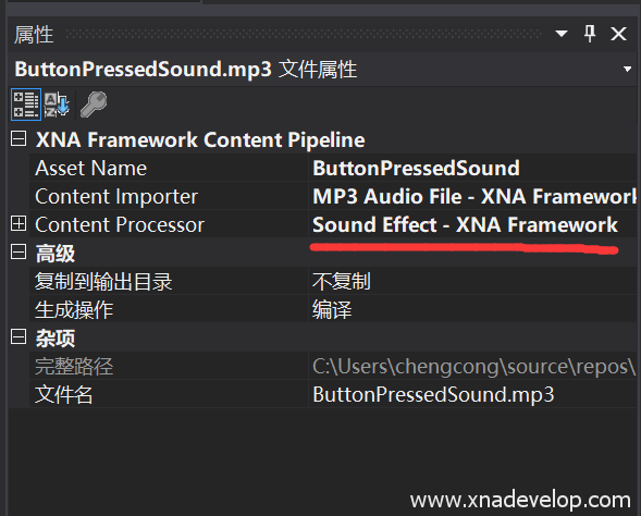 Content Processor设为 Sound Effect– XNA Framework