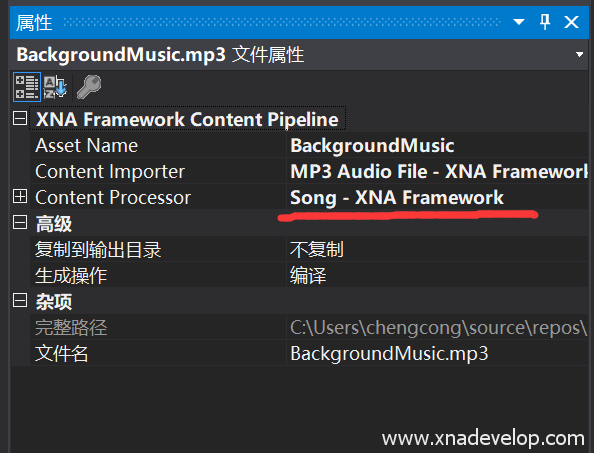 Content Processor设为 Song – XNA Framework