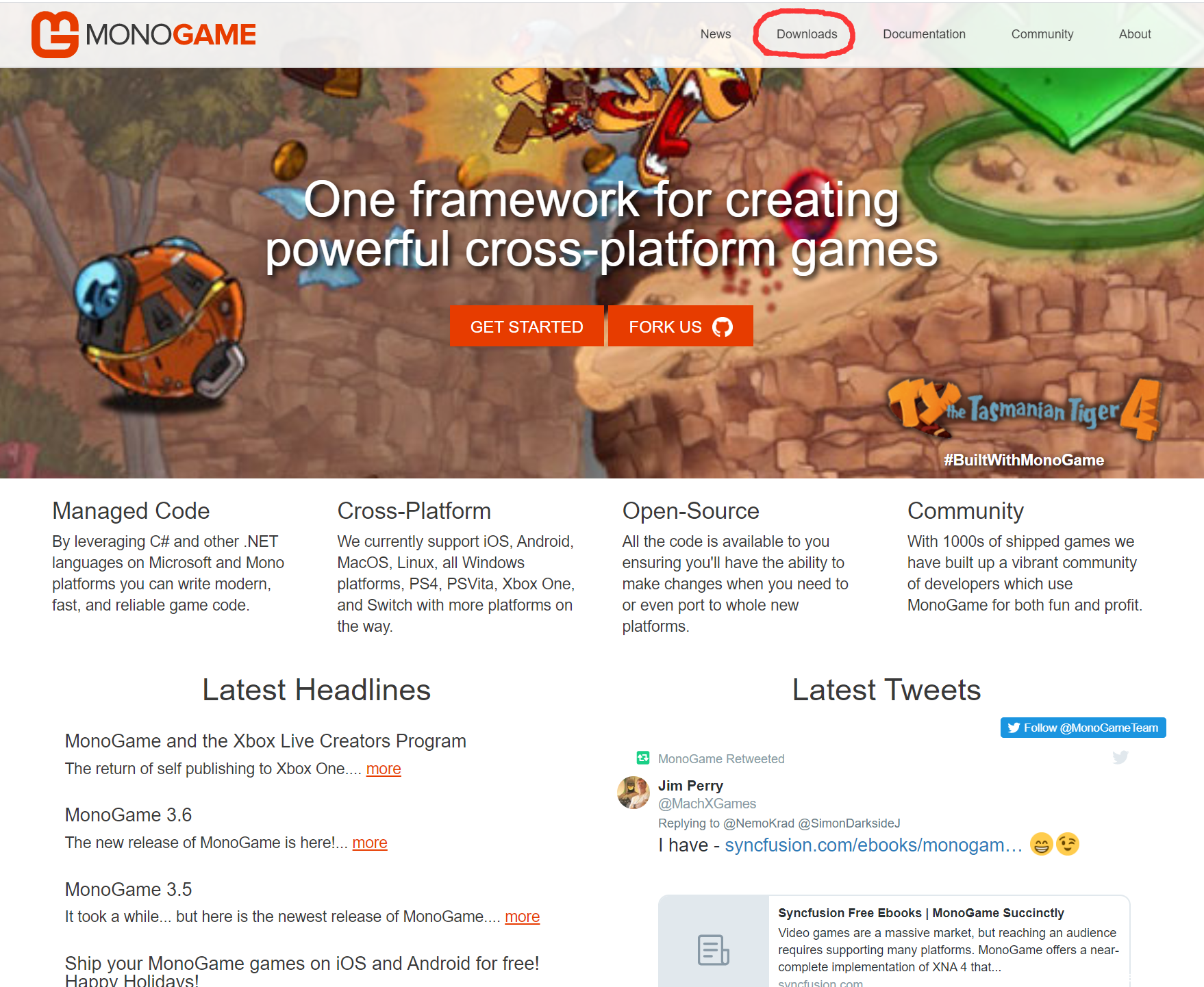 打开MonoGame官方网站http://www.monogame.net. 点击【Downloads】