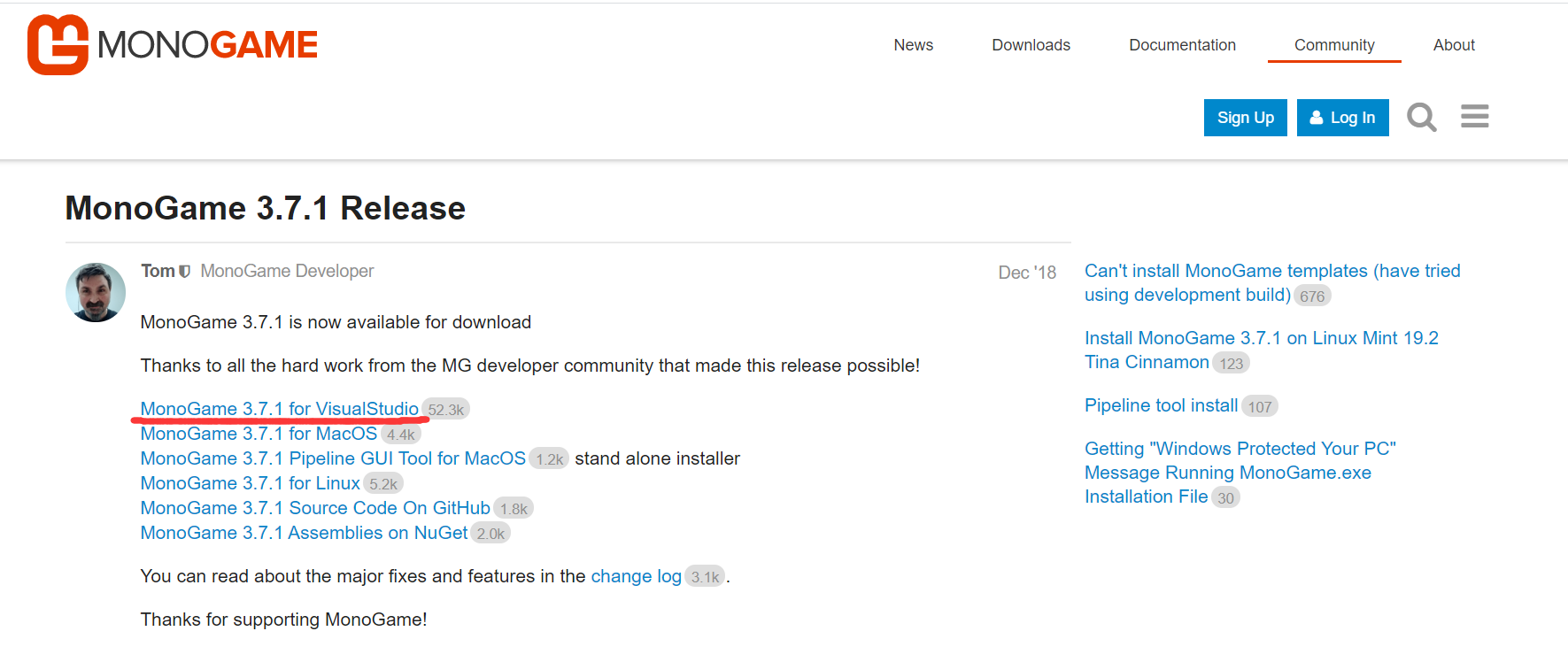 点击【MonoGame 3.7.1 for VisualStudio】或直接点击https://github.com/MonoGame/MonoGame/releases/download/v3.7.1/MonoGameSetup.exe