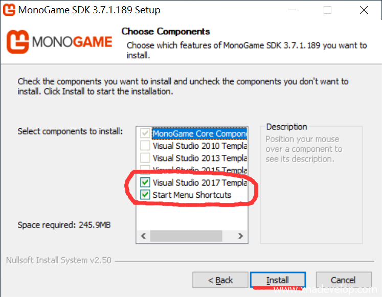 勾选【Visual Studio 2017 Template】和【Start Menu Shortcuts】,点击【Install】