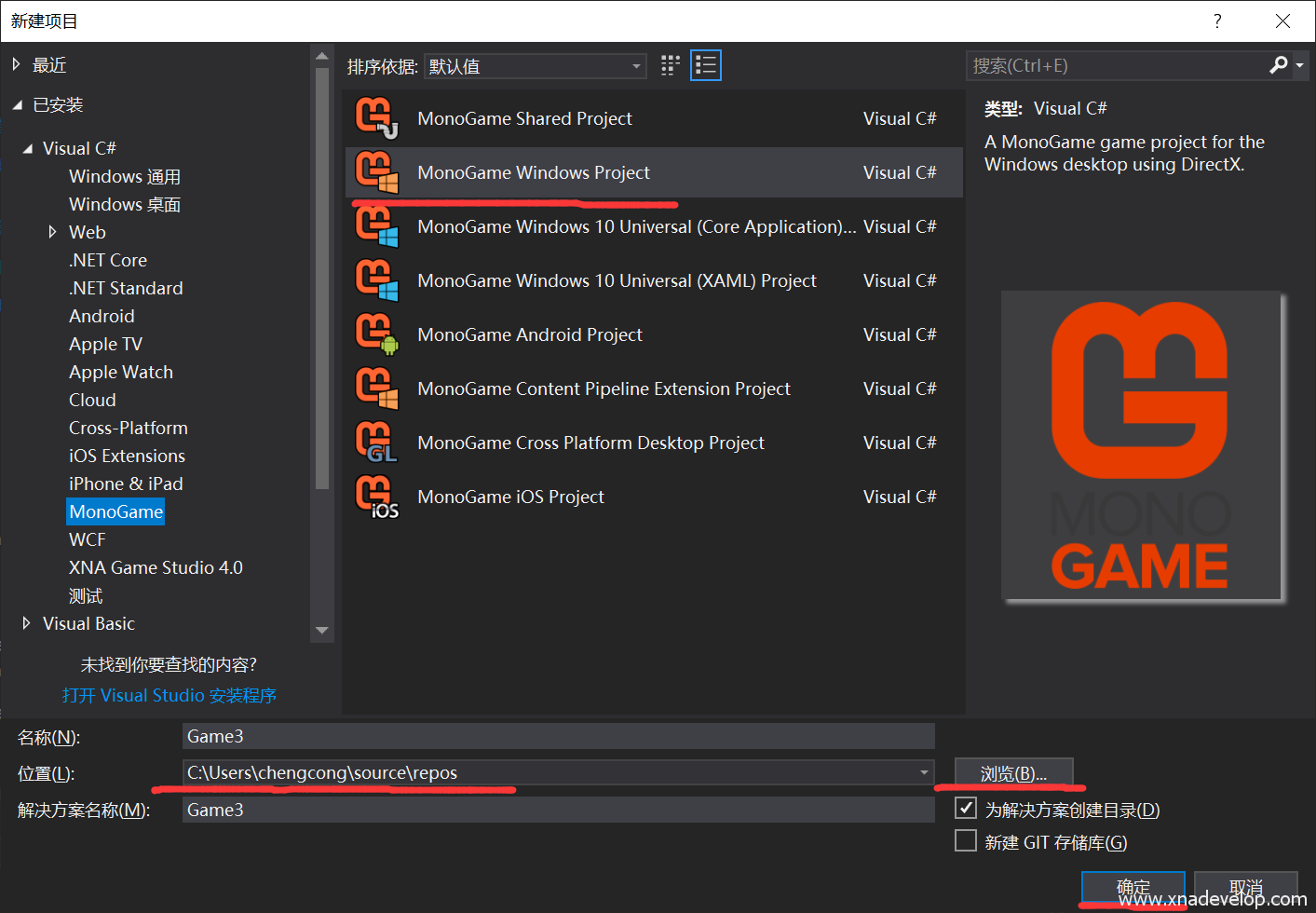 选择【MonoGame Windows Project】,修改游戏名称,以及源码的存放位置,点击【确定】