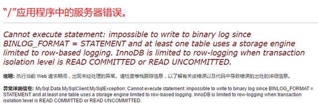 更新MySQL表数据报:Cannot execute statement: impossible to write to binary log since BINLOG_FORMAT = STATEMENT and at least one table uses a storage engine limited to row-based logging. InnoDB is limited to row-logging when transaction isolation level is READ COMMITTED or READ UNCOMMITTED.错误