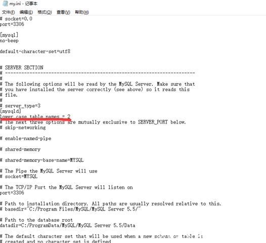 2.打开my.ini 在[mysqld]下面加入lower_case_table_names = 2