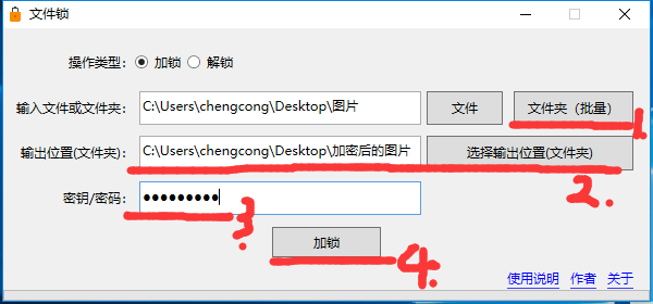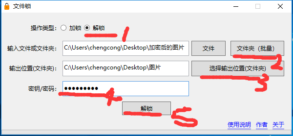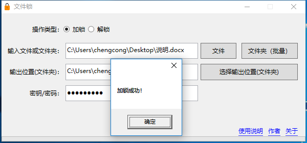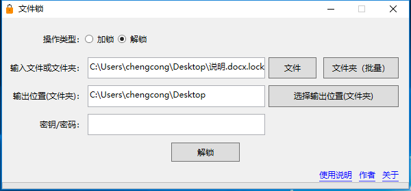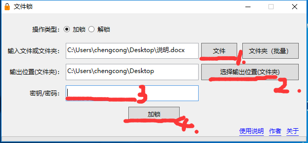 注意:密钥(密码)请妥善保管,如果丢失,将无法解锁文件!本软件的作者也无法解锁!因为本软件作者绝对不会获取您的密钥(密码)!《文件锁》本身也不会获取或存储您的密钥(密码),加密过程是一次性的!加锁(加密)文件本身也不会保存密钥(密码)